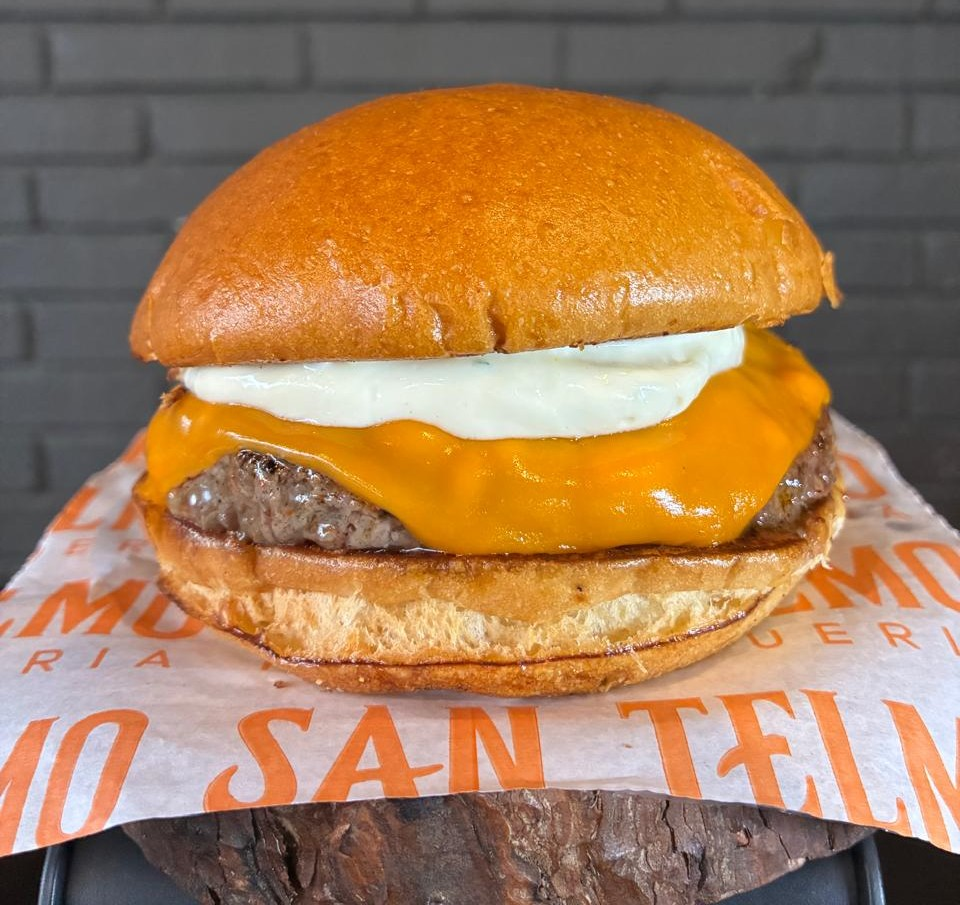Pão brioche, hambúrguer de 160g assado na brasa, queijo cheddar e maionese da casa.